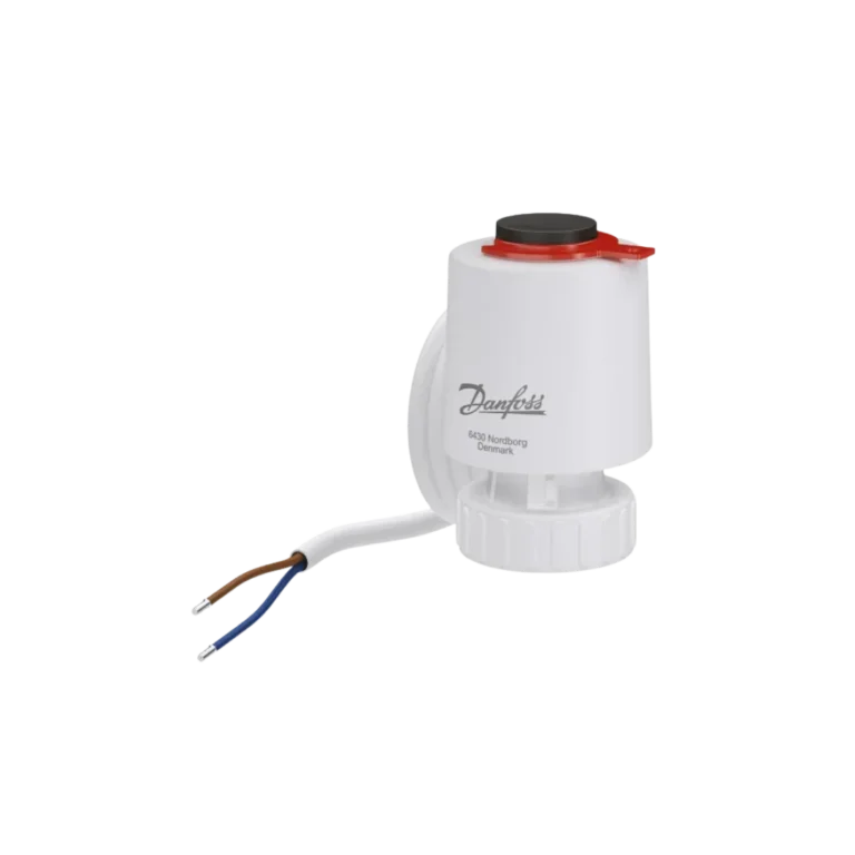 Atuador térmico compacto para válvulas de zona, versão normalmente aberta (abre sem energia). Alimentação 24 V e cabo de 1,2 m integrado para instalação rápida em sistemas HVAC.