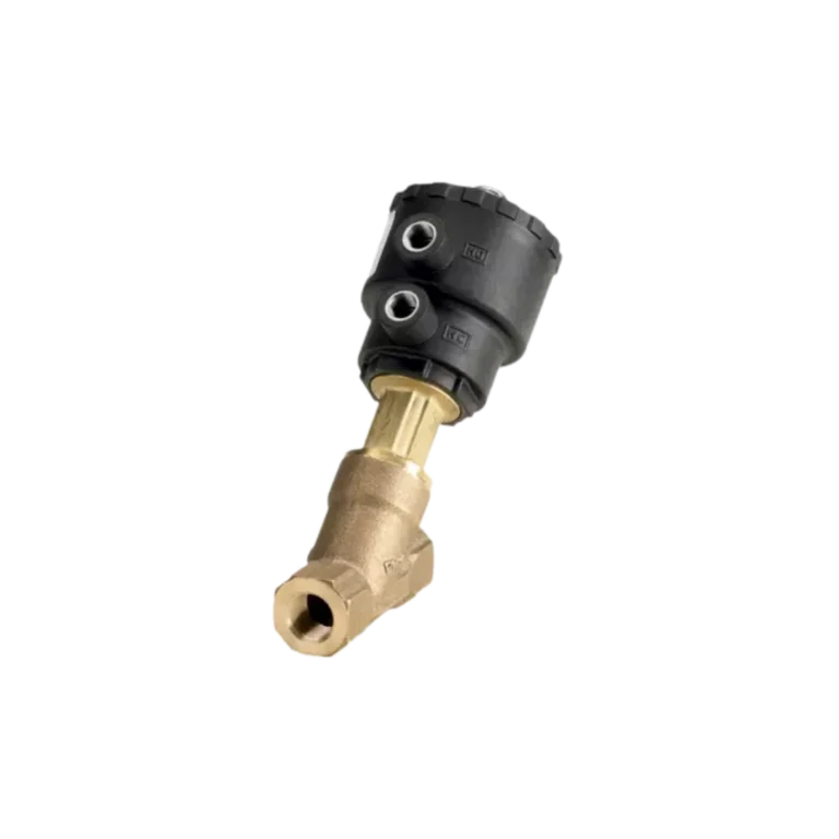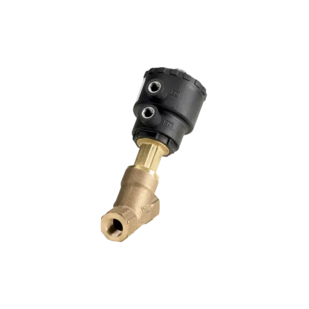 Válvula globo normalmente fechada para água, ar e óleo, adequada a controle on-off via piloto externo (ex.: EV310B). Construção compacta para linhas de utilidades e processos.