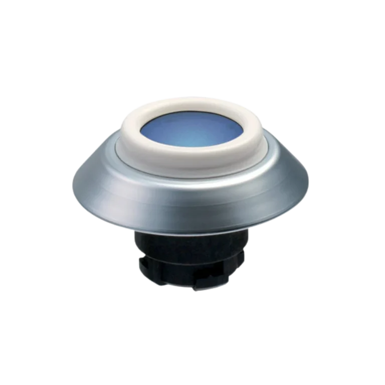Botão iluminado azul 22 mm, frente IP69K para ambientes com lavagem, ideal para comandos start/reset.