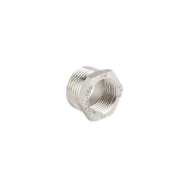 Conector de redução em latão para roscas BSP, usado para adaptar diâmetros diferentes em linhas de água, ar e utilidades.