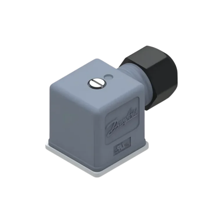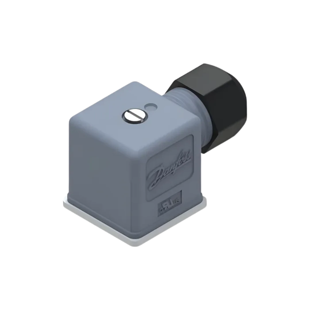 Conector angular (90°) para bobinas/solenóides Danfoss, com grau de proteção IP67. Ideal para painéis e máquinas em ambientes úmidos, oferecendo saída de cabo lateral que poupa espaço e melhora o alívio de tração.