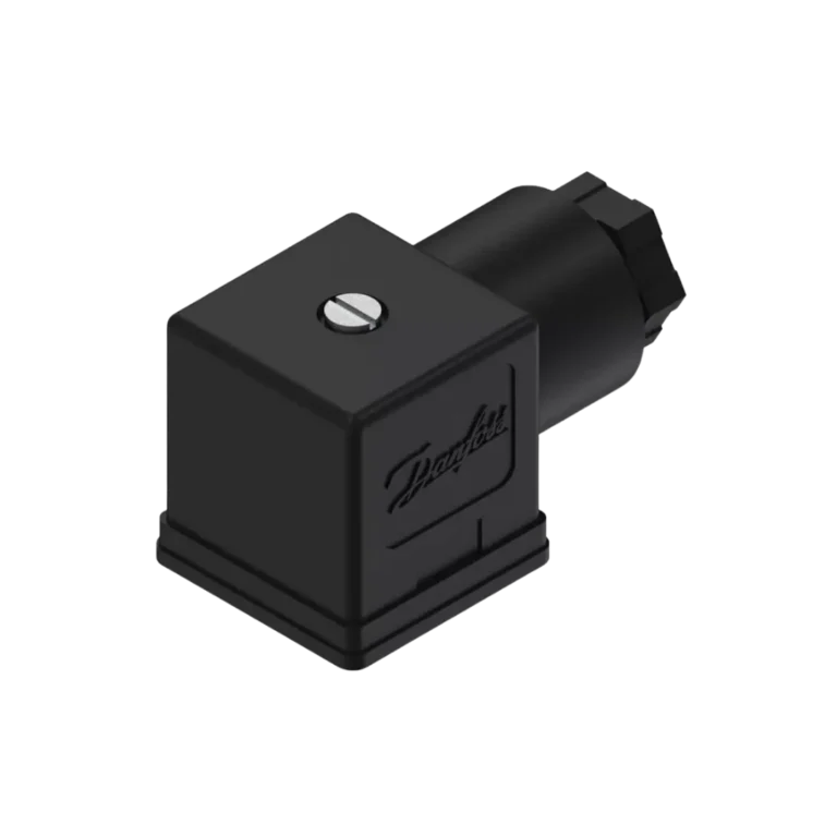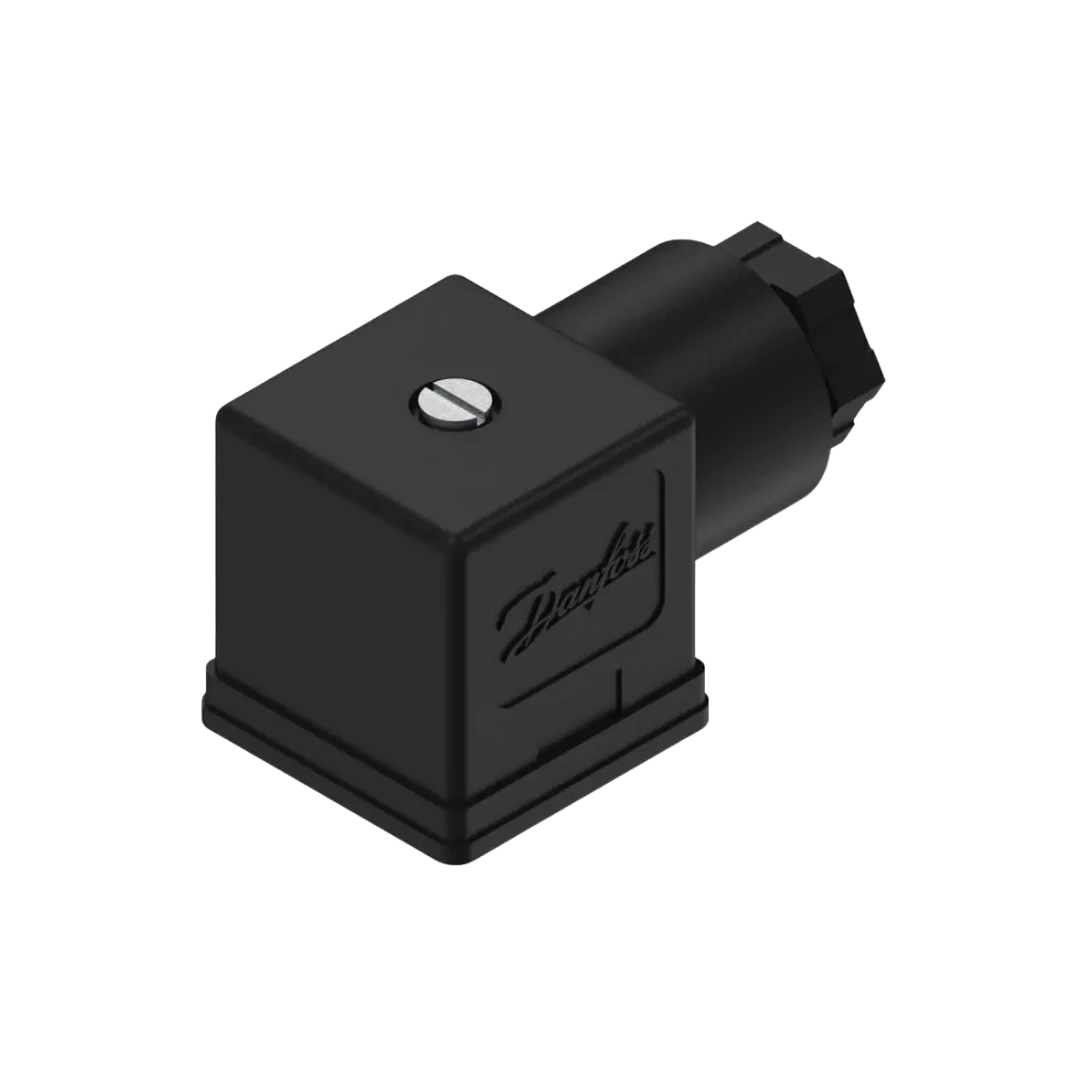 Conector elétrico angular para bobinas de válvulas solenóide Danfoss séries AB/AM. Facilita a conexão elétrica segura em ambientes industriais, com alívio de cabo e vedação.