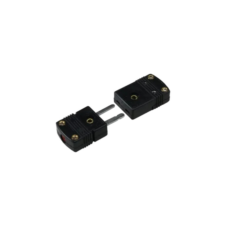 Conector padrão mini tipo J (termopar) fêmea com isolante cerâmico, alta estabilidade térmica.