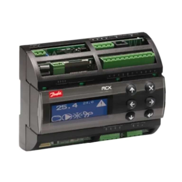 Controlador programável compacto da família Danfoss MCX para aplicações HVAC/R. Opera em 24 V, possui comunicação RS485 e seis saídas a relé para acionar cargas de campo com lógica customizável.