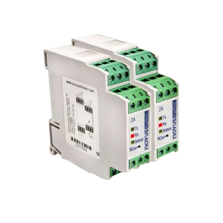 Módulo de 2 saídas analógicas para comando de válvulas, inversores e reguladores. Interface RS-485 para ajuste remoto e integração simples a CLP/SCADA. • Saídas: 2× AO (4–20 mA e/ou 0–10 V, selecionável) • Comunicação: Modbus RTU (RS-485) • Resolução/linearidade: industriais (conforme modelo) • Isolação: barramento ↔ I/O (modelo dependente) • Alimentação: 24 Vdc · Montagem: trilho DIN
