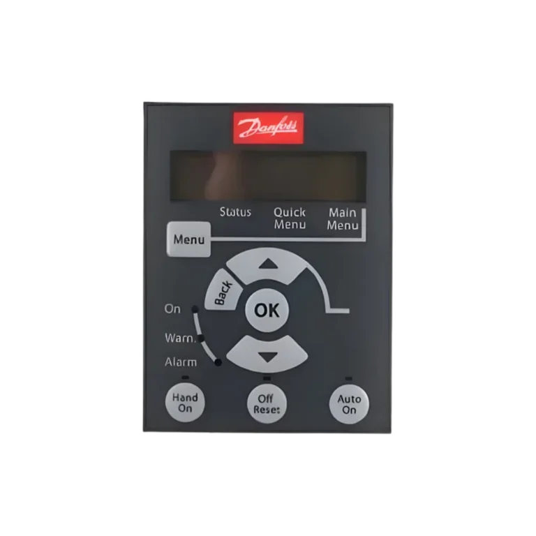 Módulo de interface local (LCP) para o VLT® Micro Drive FC-51, versão sem potenciômetro. Permite parametrização, leitura de status e operação local com navegação simples, agilizando comissionamento, diagnóstico e manutenção.