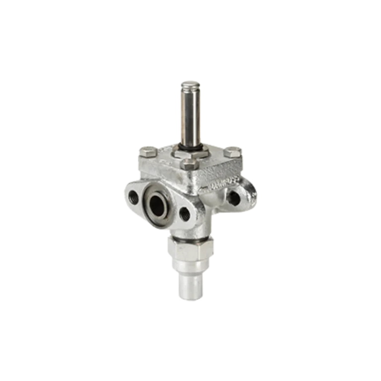 Válvula solenoide EVRA 10 com operador manual, indicada para refrigeração industrial. Permite manobras locais sem energização para teste/manutenção.