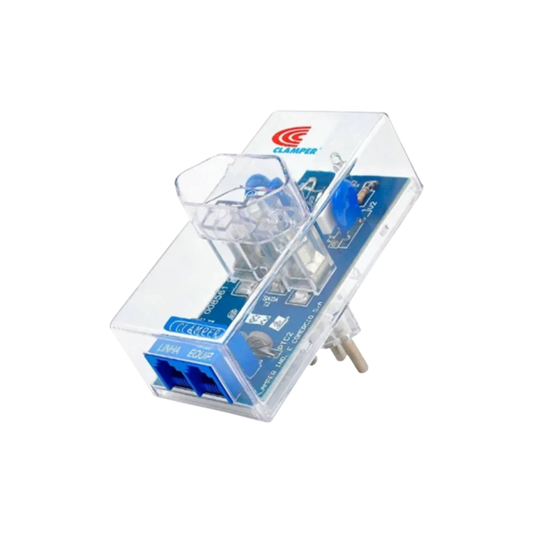 Protetor contra surtos para linhas telefônicas/dados, resguarda fax/modem e gateways frente a descargas e ruídos conduzidos.