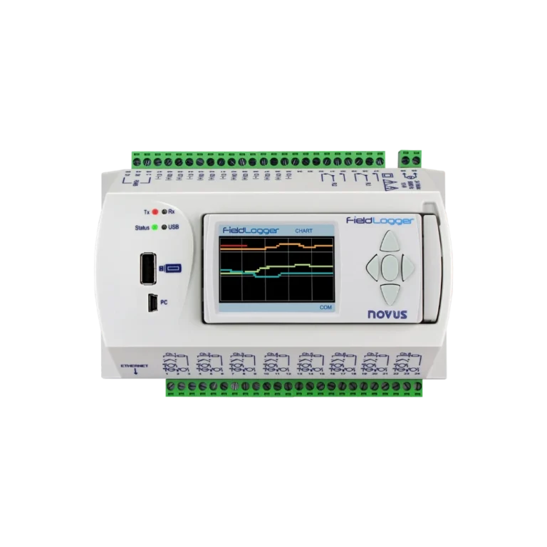 Módulo IHM frontal para operação local do FieldLogger 512 k. Permite visualização dos canais, navegação de menus e ajustes sem PC. • Interface: display + teclas • Funções: start/stop, setpoints, consulta de registros • Instalação: frontal no logger • Indicação: estados/alarme • Compatibilidade: FieldLogger 512 k