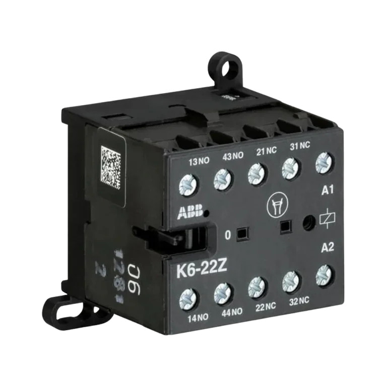 Minicontator auxiliar K6 com bobina 220 Vca, indicado para lógicas de comando e intertravamentos. Configuração 22Z (contatos auxiliares combinados). • Bobina: 220 Vca • Contatos: 22Z (tip. 2NA + 2NF) • Uso: comandos AC-15/DC-13 • Montagem: trilho DIN, bornes a parafuso