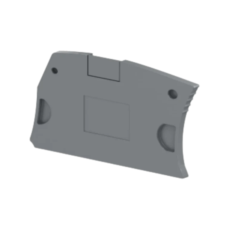 End plate ES4 cinza para bornes a parafuso, cobrindo famílias de 4 a 25 mm². • Função: fechamento/isolação lateral • Uso: trilhos DIN em painéis de comando • Material: termoplástico isolante • Cor: cinza (CZ)