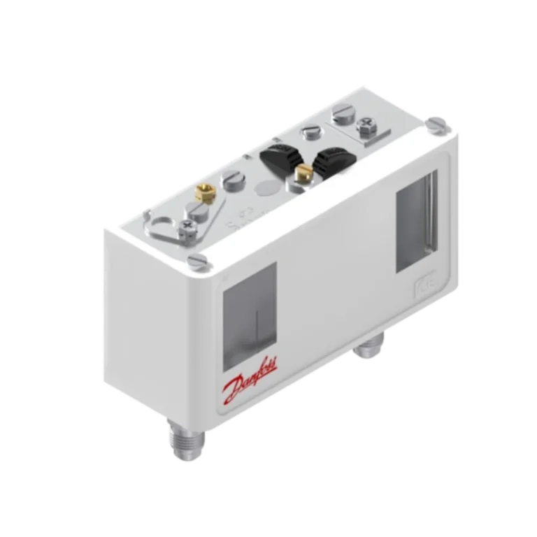 Pressostato duplo Danfoss KP15 com dois circuitos independentes (alta e baixa), usado para proteção/comando em compressores e linhas de líquido/sucção. Permite ajustes separados, oferecendo intertravamento de segurança no mesmo invólucro.