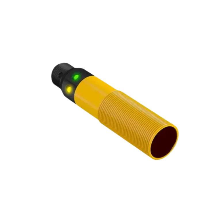 Sensor M18 em modo difuso (D), detecta diretamente o alvo sem refletor. Solução versátil para presença/ausência com ajuste de sensibilidade simples e instalação rápida.