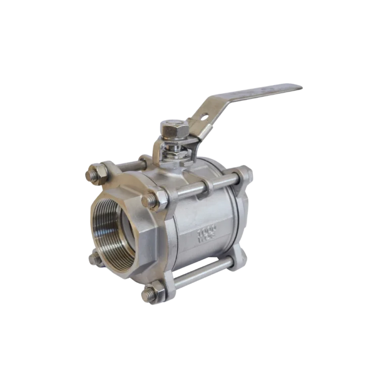 Válvula esfera inox 304 tripartida 2½”, sede PTFE, rosca BSP, 1000 WOG; manutenção facilitada e baixa perda de carga.